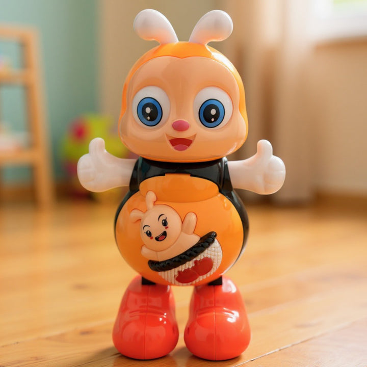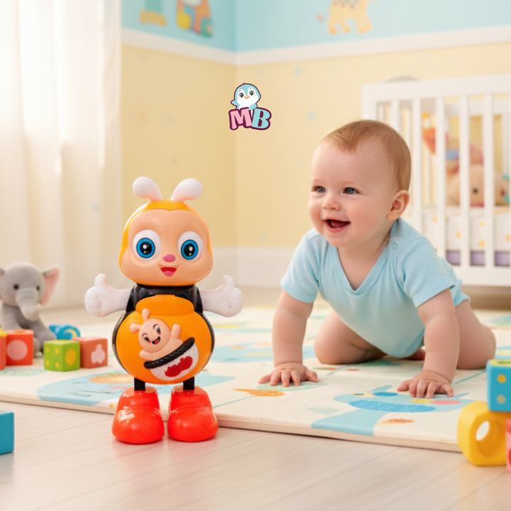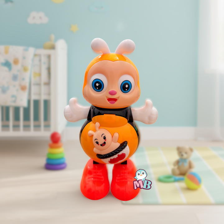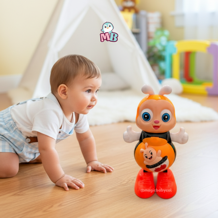 ¡La favorita de los peques! Esta abejita reproduce la canción “Abejita Chiquitita”, se mueve y tiene divertidas luces que captan la atención del bebé, ayudando a estimular la audición, la vista y la motricidad.
