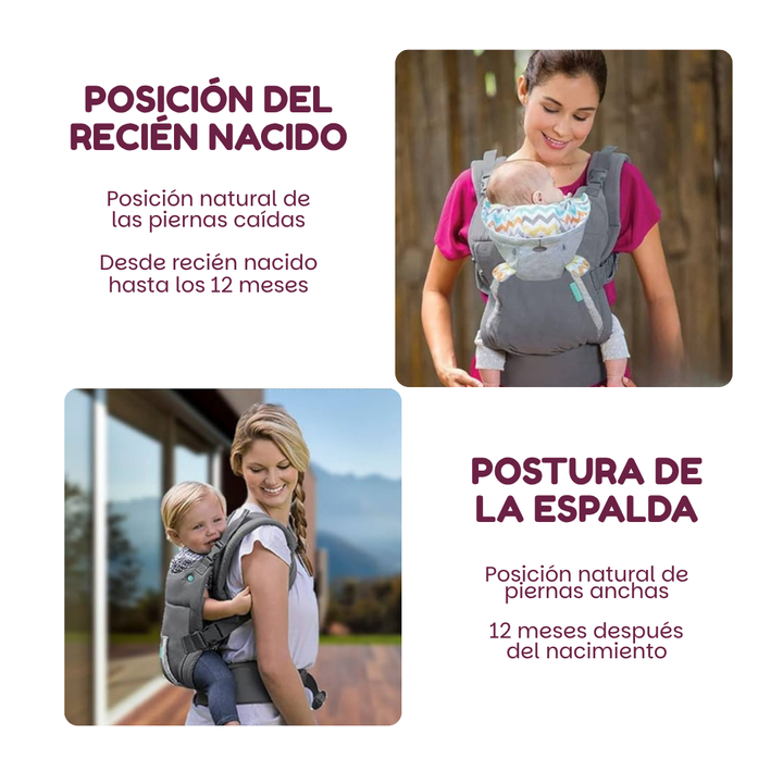 El bebé está sostenido de rodilla a rodilla con una espalda naturalmente redondeada para un viaje seguro y cómodo.