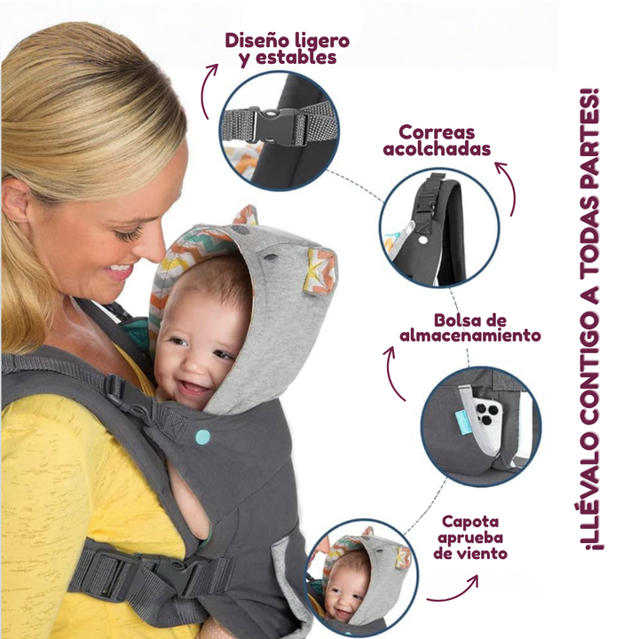 Este portabebés ergonómico cuenta con una capucha con dosel arqueada única que mantiene al bebé a la vista y felizmente cubierto.