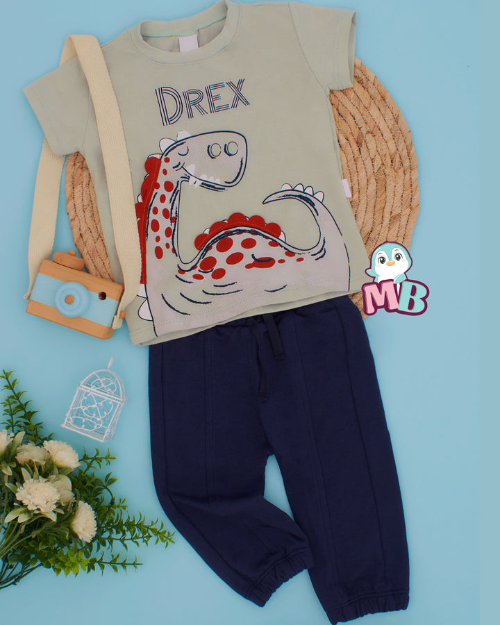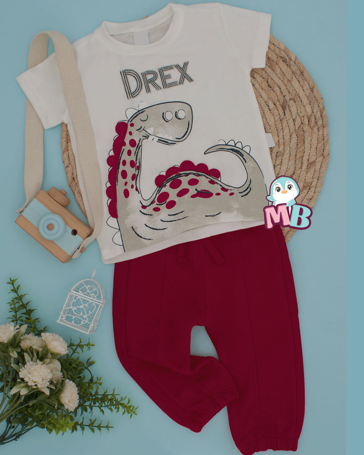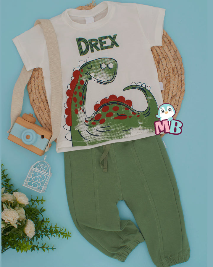 La camiseta blanca, con un estampado vibrante de dinosaurio y la palabra Drex, aporta un toque divertido y lleno de energía. El pantalón, confeccionado en tela suave y fresca, brinda comodidad durante todo el día y libertad total para moverse y jugar.