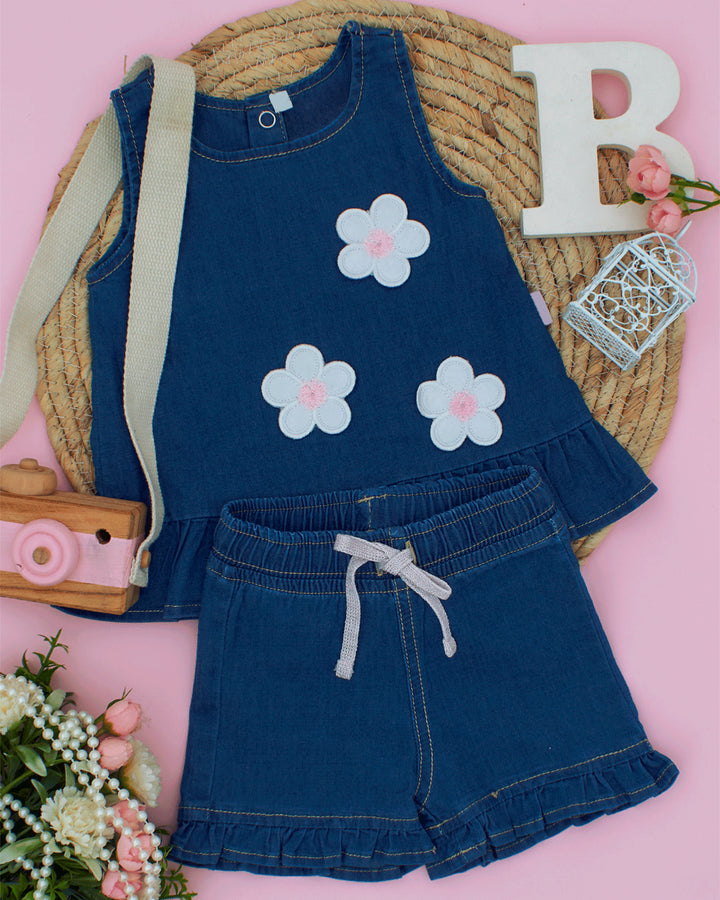 Este conjunto de blusita sin mangas con flores y short en mezclilla suave es perfecto para días llenos de juego y comodidad. Su tela es ligera, fresca y fácil de lavar, ideal para que tu niña se mueva libremente y siempre luzca hermosa. ✨