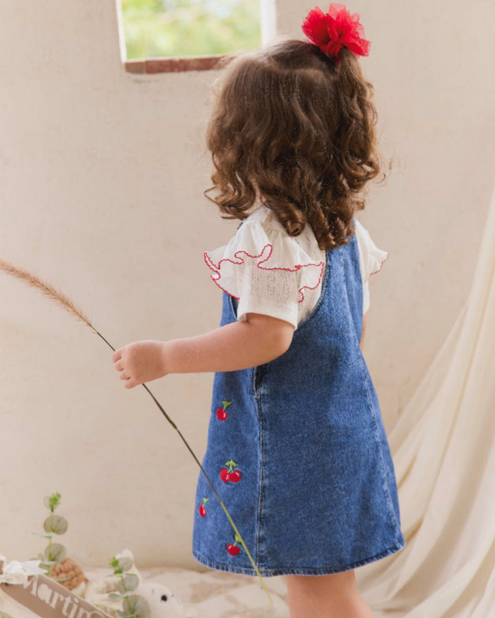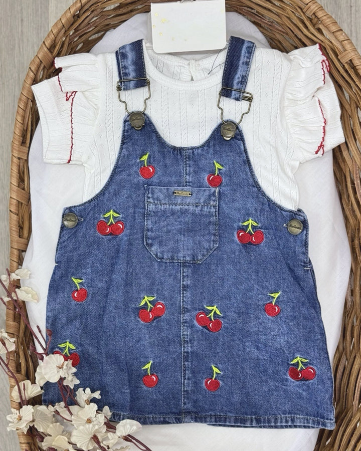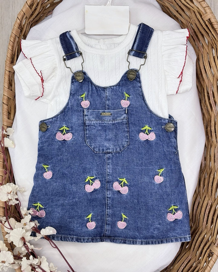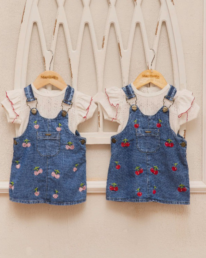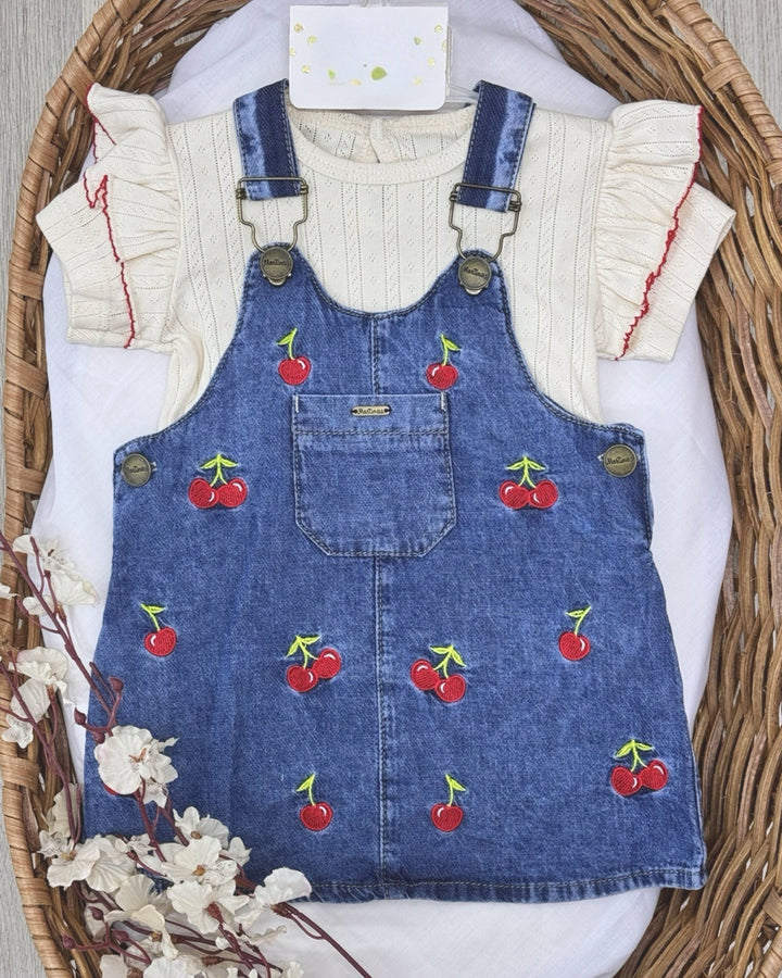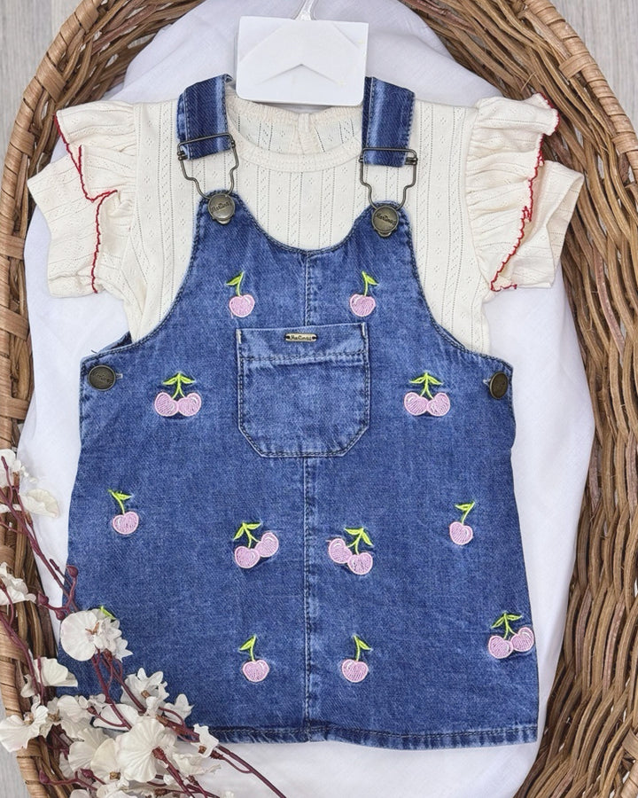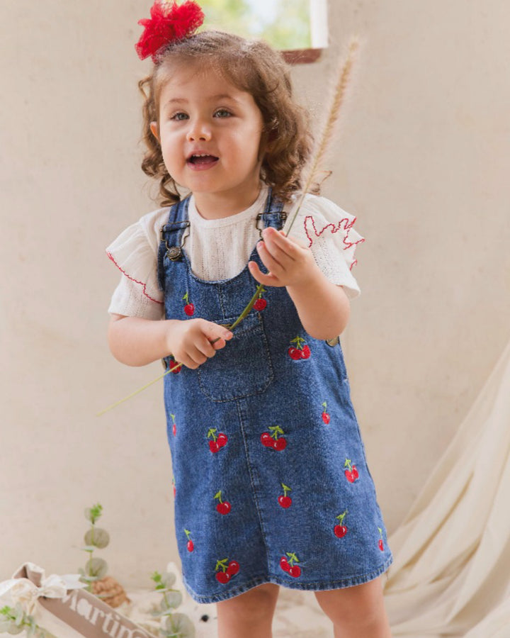 Estas jardineras de mezclilla son puro encanto para las más pequeñas. Vienen con bordados de cerezas que las hacen súper tiernas y combinan con todo. 🍒