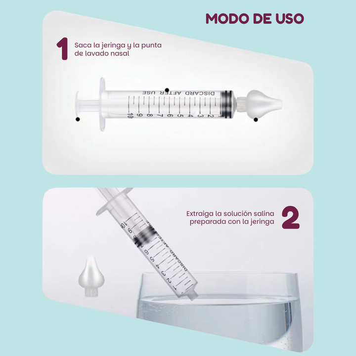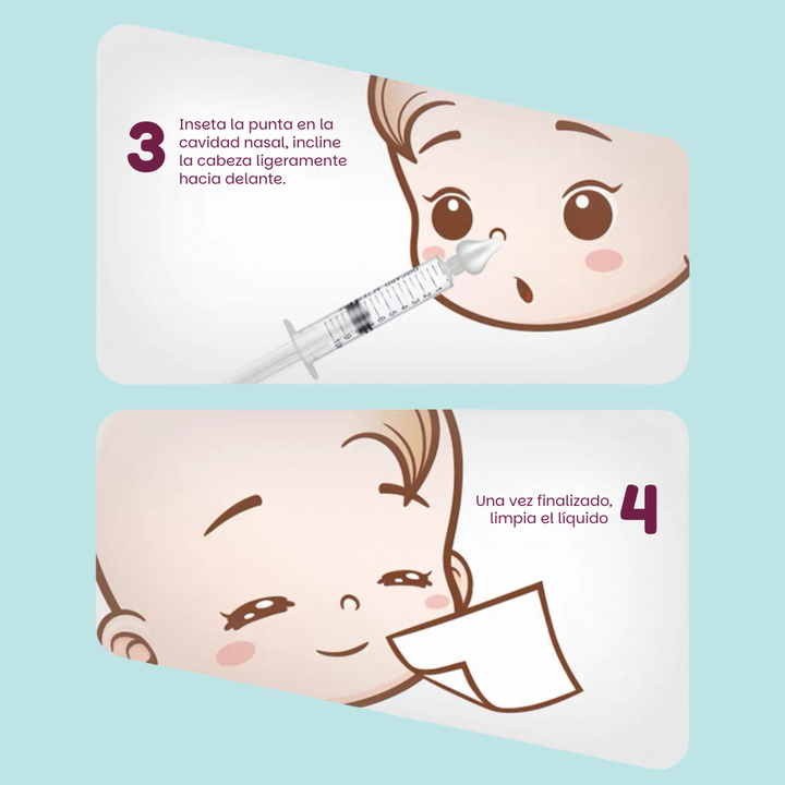 Límpiala con agua y rellena con solución nasal o suero fisiológico.