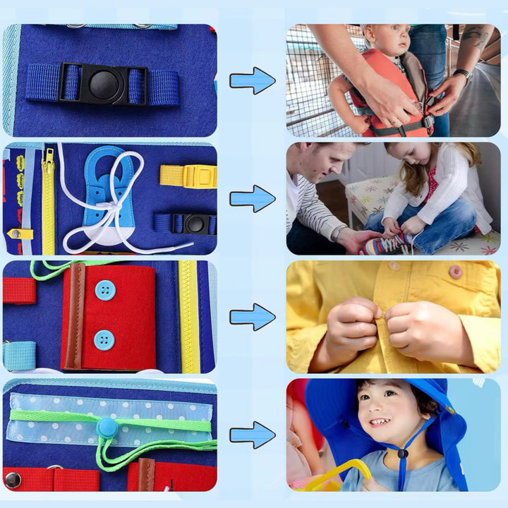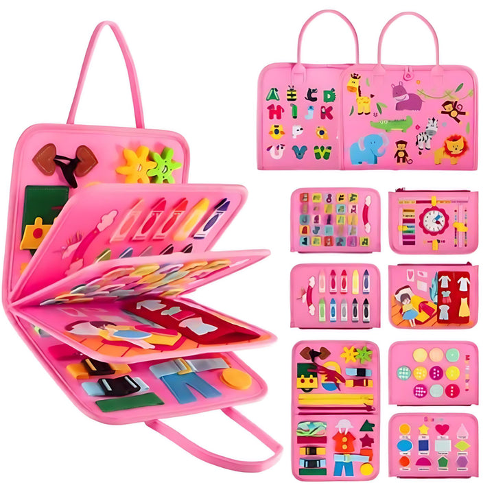 ¡Diversión y aprendizaje en un solo libro! Este libro interactivo tipo bolso está diseñado para niños de 1 a 6 años e incluye actividades para aprender colores, números, letras, animales, clima, reloj, vestirse ¡y mucho más!