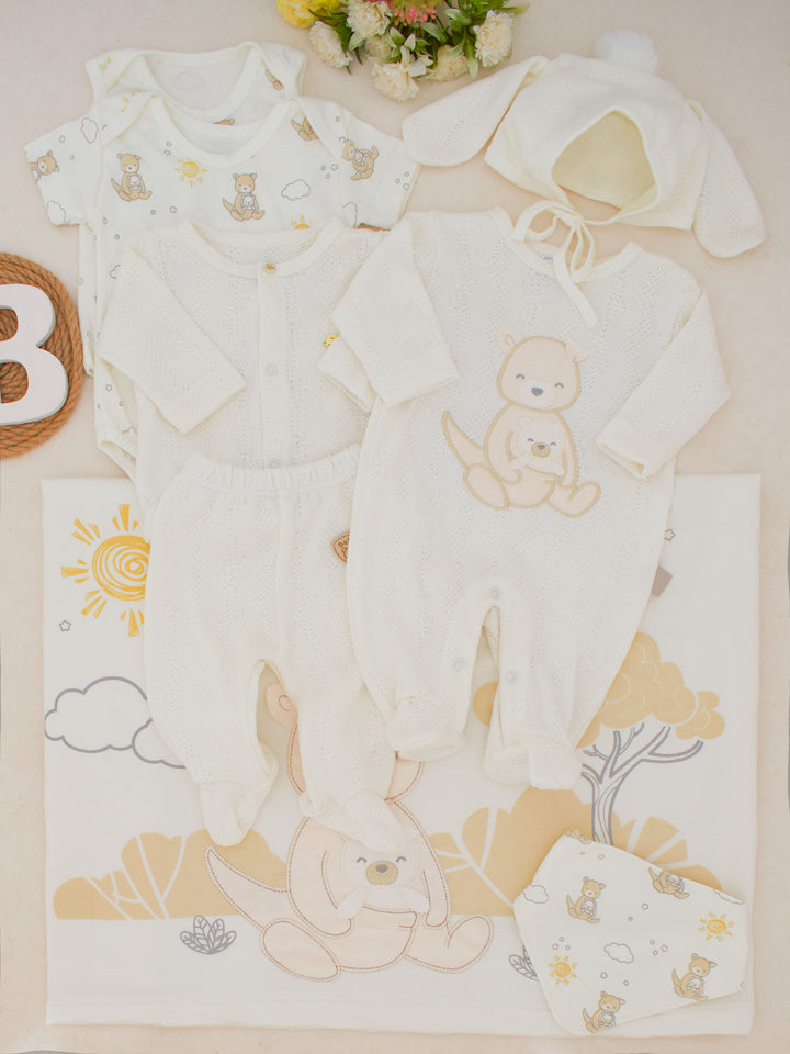 Estos sets vienen con todo lo que necesitas: enterizos, bodies, pantaloncito, gorrito, babero y mantita a juego 🧸.