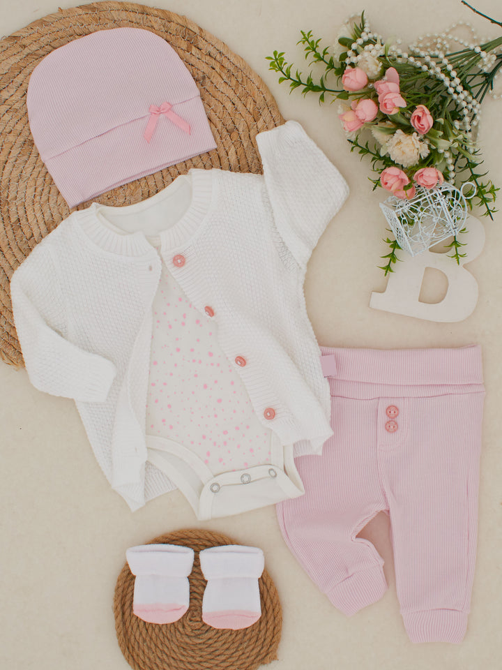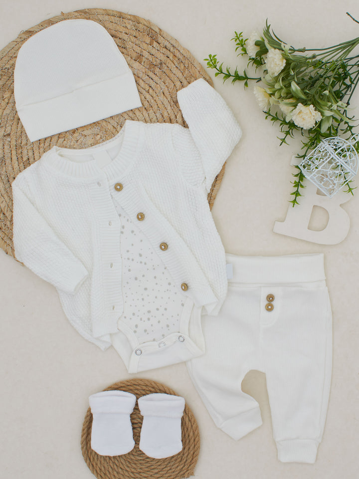 Estos conjuntos son puro amor y comodidad. Incluyen gorrito, body, pantaloncito, saquito tejido y medias, todo pensado para mantener a tu peque abrigadito, cómodo y con un estilo tierno y delicado. 💕