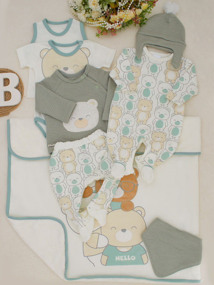 Este adorable set de recién nacido lo tiene todo para que tu bebé esté abrigadito, suave y lleno de ternura. Incluye enterizo, pantaloncito, body, camiseta, gorrito con pompón, babero y manta, todo con un diseño encantador de ositos.
