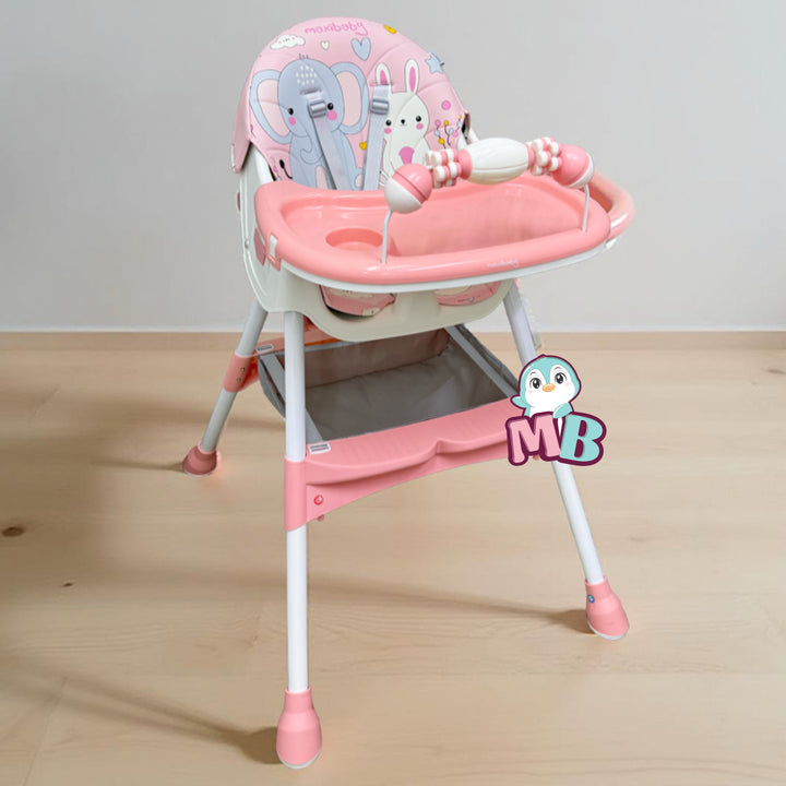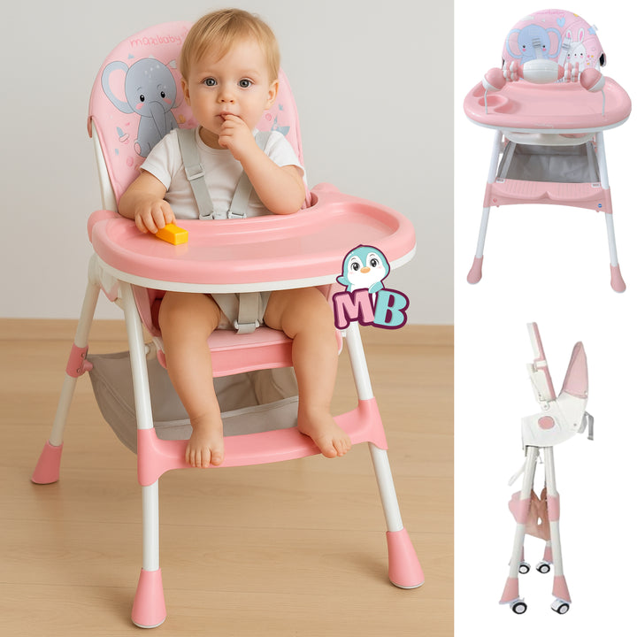 Nuestras sillas comedor están diseñadas para hacer más fácil y cómoda la hora de la comida. Cuentan con bandeja ajustable y removible, un arnés de seguridad, y un práctico canasto inferior para guardar accesorios. Además, su diseño plegable permite guardarlas sin ocupar mucho espacio.