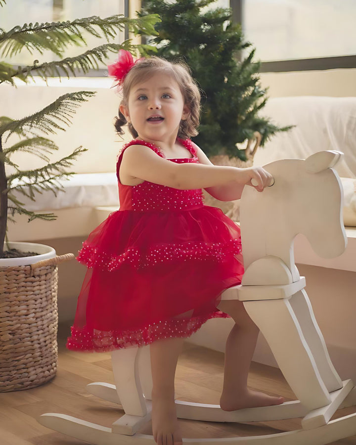 Este hermoso vestido es perfecto para ocasiones especiales, fotos o celebraciones. Su tela suave, las capas de tul y los delicados detalles brillantes le dan un toque elegante y muy tierno. Además, es cómodo y ligero, ideal para que tu pequeña se mueva y juegue feliz. ✨